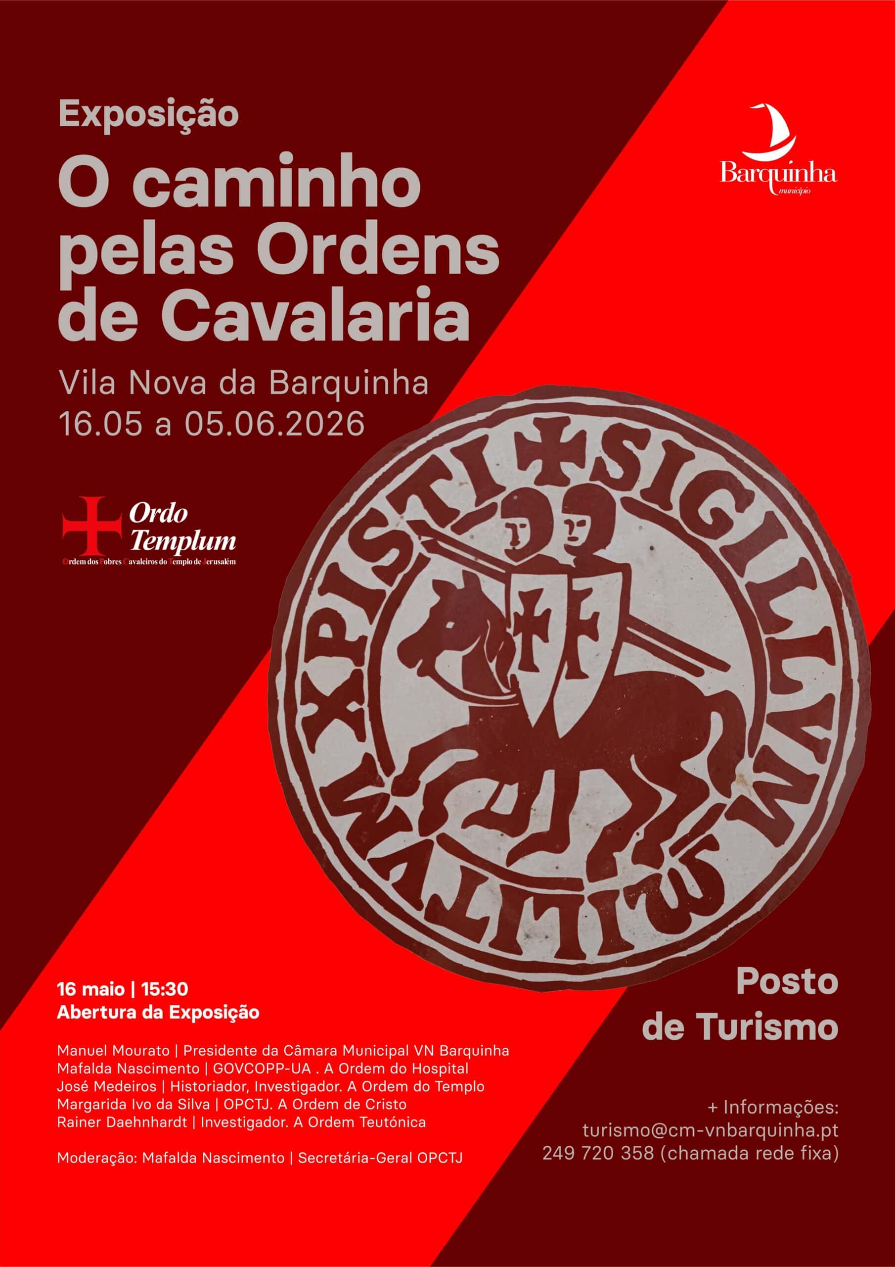 No dia 16 de maio, sábado, pelas 15H30, em Vila Nova da Barquinha, será inaugurada a exposição “O caminho pelas Ordens de Cavalaria”, com enfoque nas Ordens do Hospital, do Templo, de Cristo e Teutónica, numa perspetiva cronológica. Abertura a cargo do Senhor Presidente da Câmara Municipal de Vila Nova da Barquinha Manuel Mourato.