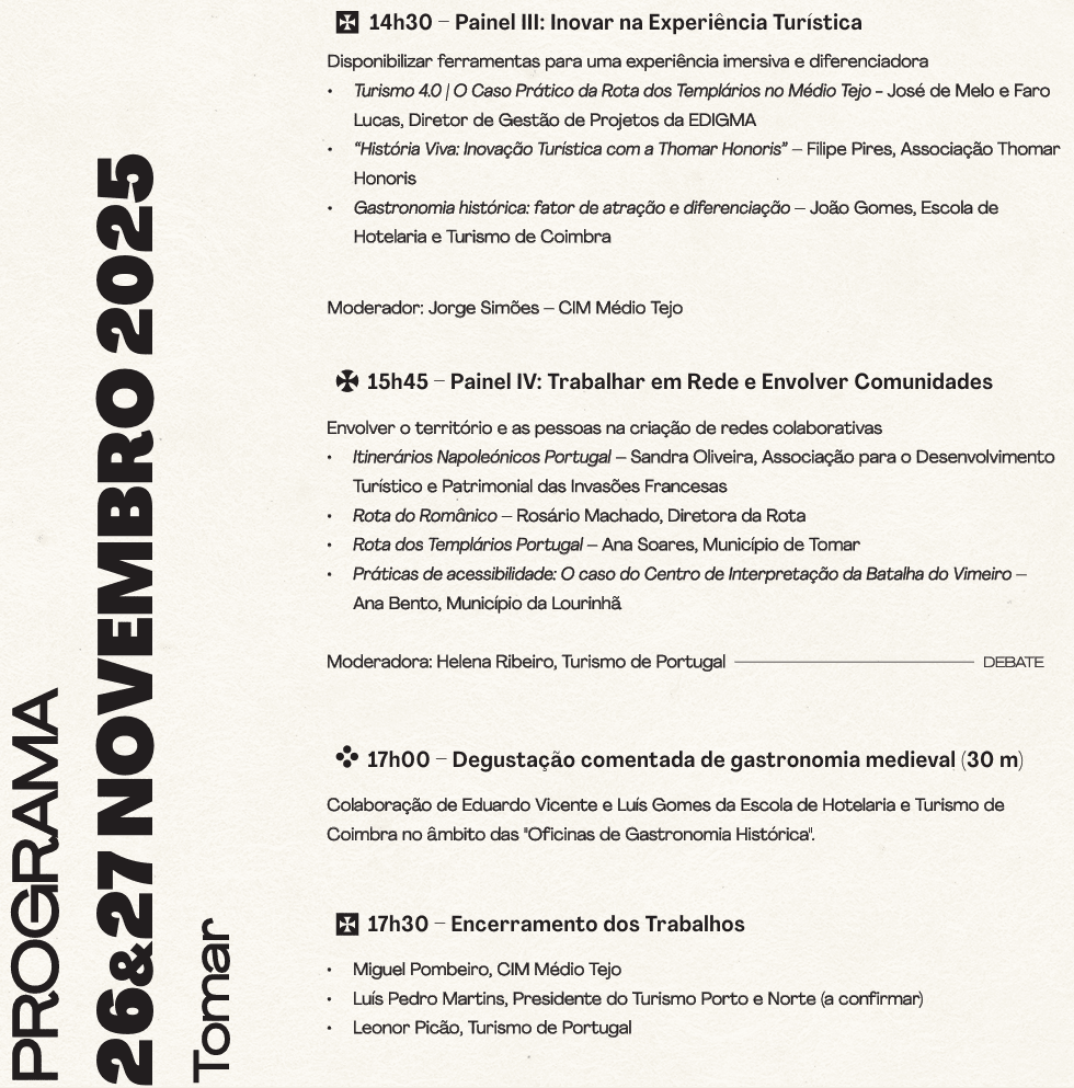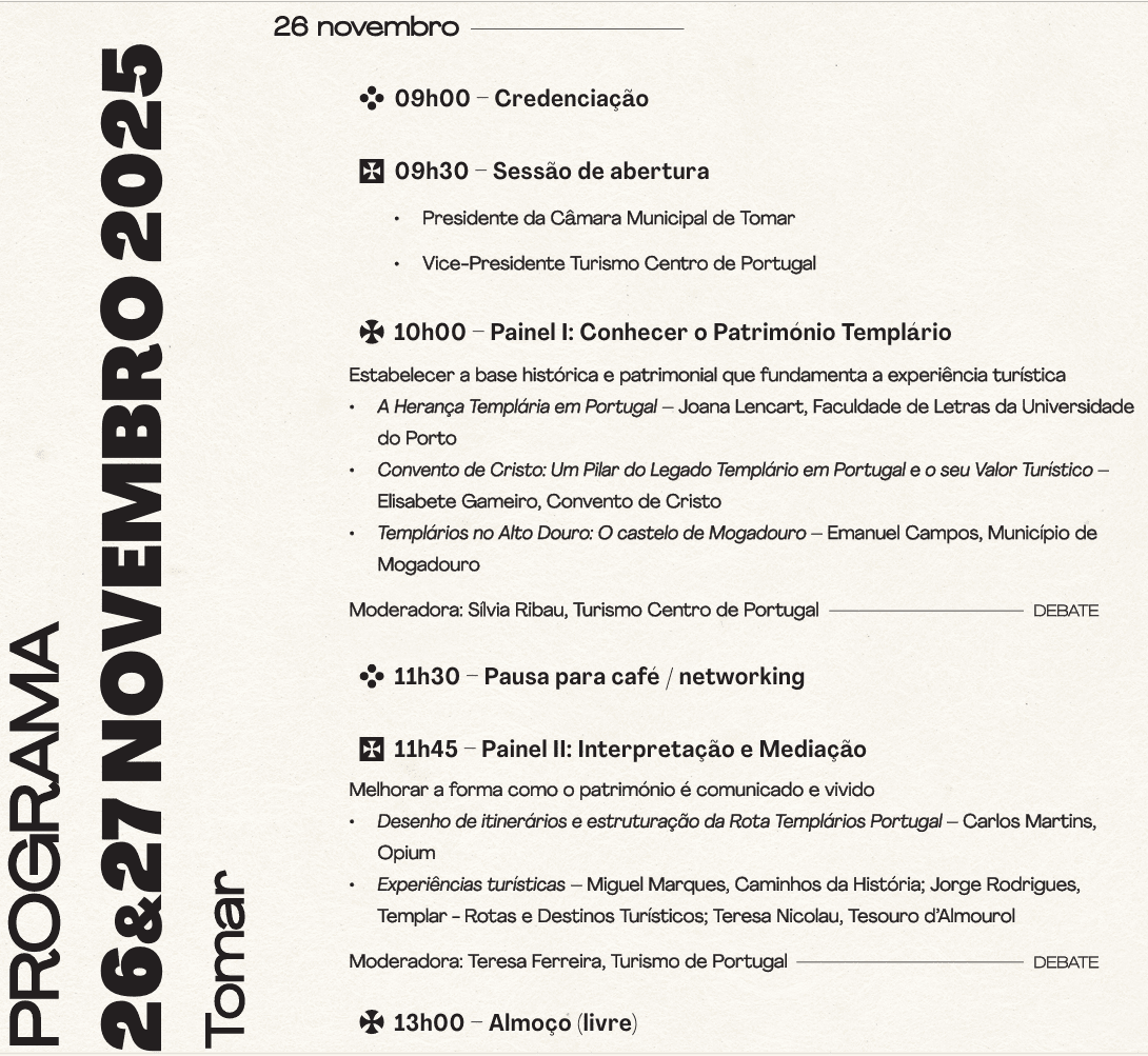 O I Encontro da Rota dos Templários Portugal decorreu nos dias 26 e 27 de novembro de 2025. Nesta iniciativa, a Direção e as estruturas Museu Ordem dos Templários (MOT) e Centro de Estudos (CE-OPCTJ) da Associação Ordem dos Pobres Cavaleiros do Templo de Jerusalém (OPCTJ) juntaram-se aos seus vários parceiros e municípios com que tem vindo a desenvolver trabalho na temática templária.